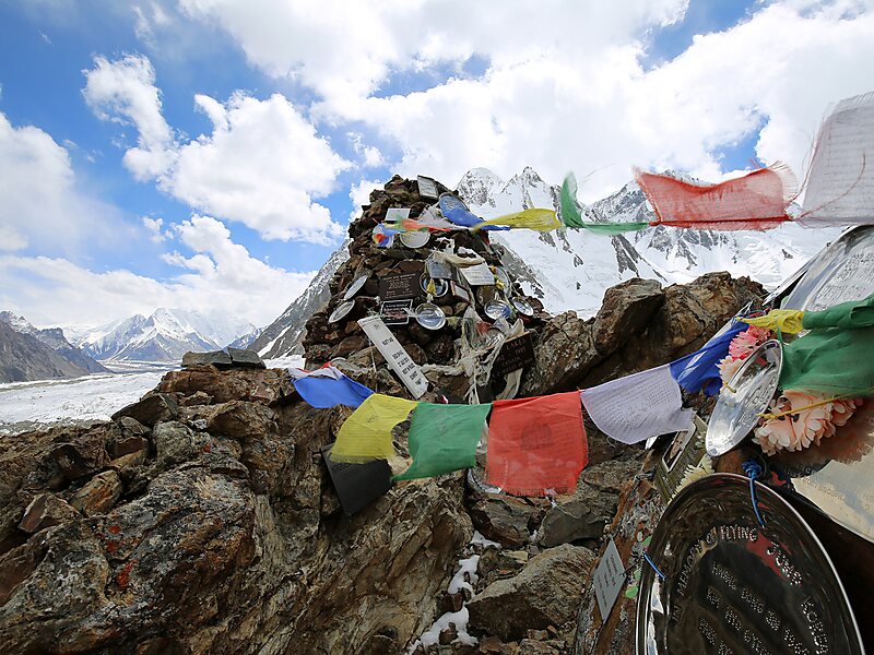 The Gilkey Memorial is a memorial and tomb for those who have died while climbing K2. The memorial is named after Art Gilkey who died on the mountain in 1953.The memorial is a stone cairn covered with metal plaques. Each plaque is inscribed with the details about the dead climber like when they went missing or were found dead.In 2002 when his remains were found, a plaque was added for Dudley Wolfe, the American climber who had died on the mountain during the 1939 American expedition.