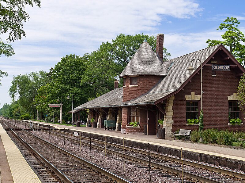 Like the Braeside train station, Glencoe is in close proximity to the Cook County Forest Preserves' Turnbull Woods, William N. Erickson Preserve, and the Chicago Botanic Garden. Unlike Braeside, Glencoe was built in a partial Romanesque-style for the Chicago and North Western Railway by architect Charles Sumner Frost in 1891. The Green Bay Bike Trail, and the local Veterans Memorial Park are also nearby.