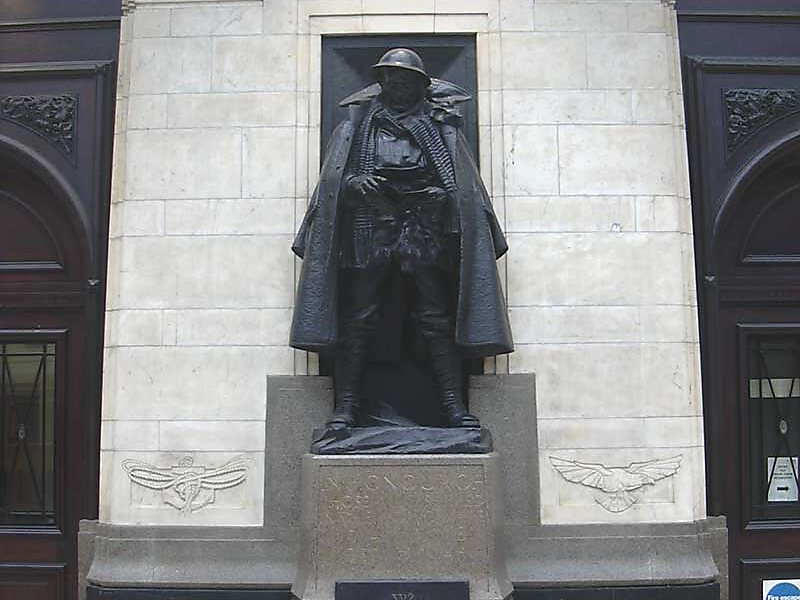 The Great Western Railway War Memorial is a First World War memorial by Charles Sargeant Jagger and Thomas S. Tait. It stands on platform 1 at London Paddington station, commemorating the 2,500 employees of the Great Western Railway who were killed in the conflict. One-third of the GWR's workforce of almost 80,000 left to fight in the First World War, the company guaranteeing their jobs, and the GWR gave over its workshops for munitions manufacturing as well as devoting its network to transporting soldiers and military equipment. The company considered several schemes for a war memorial before approaching Jagger to design a statue. Some officials continued to push for an alternate design, to the point that Jagger threatened to resign. Jagger was working on several other war memorial commissions at the same time as the GWR's, including his most famous, the Royal Artillery Memorial.