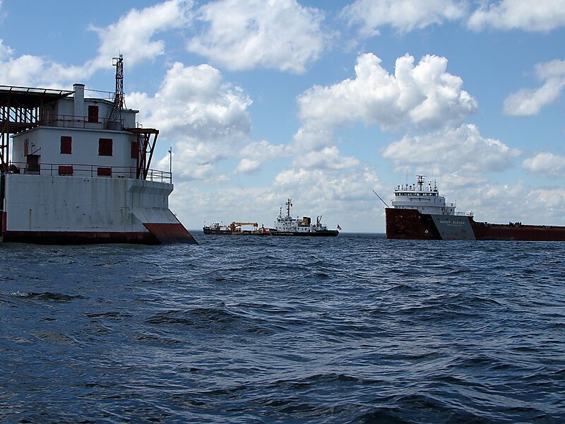 Light characteristic is a flashing red light, every 5 seconds, visible for 12 miles. Its tower has been removed, the structure is merely a 3-story base which houses the keeper's quarters, with the light mounted on a skeletal mast. The lighthouse also has a helipad. It formerly housed a non-directional beacon as part of the precision approach at Sault Ste. Marie Airport but has since been decommissioned and the antenna taken down due to high maintenance costs.