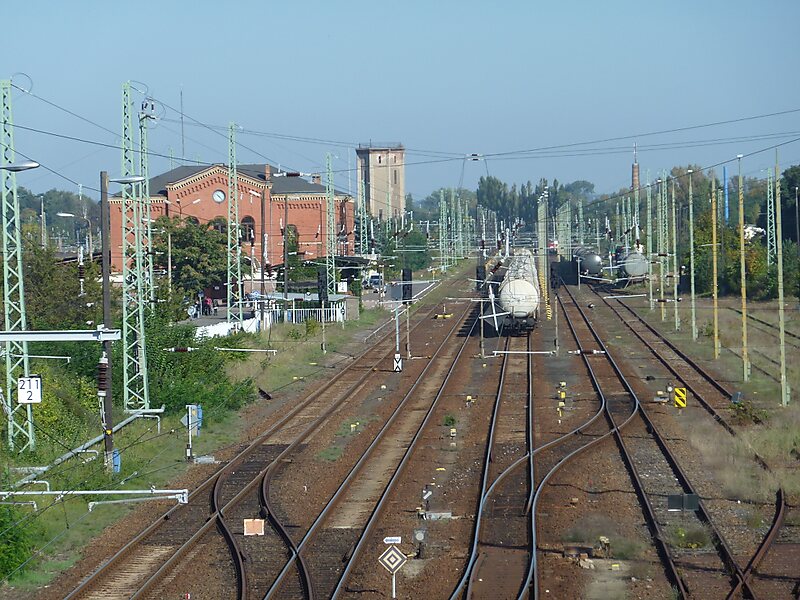 Guben station is a station of Guben in the German state of Brandenburg. It is at the junction of lines from Berlin to Wrocław via Frankfurt and from Cottbus to Zbąszynek. The station building is surrounded by the tracks. Only the route between Frankfurt–Cottbus is used by passenger services, while the line towards Zbąszynek is used for freight traffic.