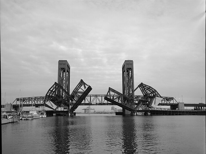 The original 1924 bascule bridge was dismantled and replaced in 1996 by a vertical-lift bridge.