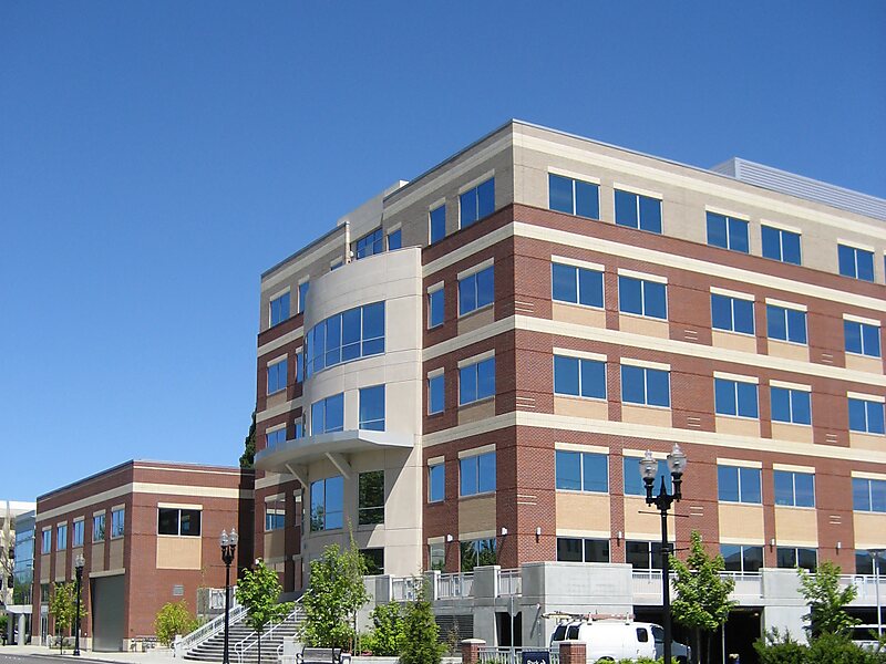 The Hillsboro Civic Center is a government-built, mixed-use development in downtown Hillsboro, Oregon, United States. The development includes the city hall for the county seat of Washington County, located west of Portland, Oregon. Covering 6 acres, the Civic Center has a total of over 165,000 square feet in the complex. The total of six stories for the main structure makes the building the tallest in the city, tied with Tuality Community Hospital. In addition to government offices, the Civic Center includes retail space, public plazas, and residential housing. The complex was built to centralize city government functions under one roof.
