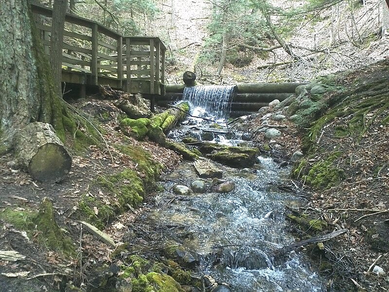 Iargo Springs in Oscoda, Michigan, features several viewing decks and a boardwalk path through the natural springs. Natural springs are formed from water that naturally flows to the surface from underground. The natural springs can be accessed from the road by stairs leading down to the Au Sable River. Man-made barriers pool the springs and create small waterfalls. The wooden boardwalk stretches over 1,000 feet as it winds through the natural springs.Lying off of River Road National Scenic Byway, Iargo Springs provides a panoramic view of the Au Sable River. Used as a drinking water source since pre-settlement times, dams were constructed on the springs by early loggers before the turn of the century. The dams were useful in diverting water to the logging camps nearby. Most of Cooke Pond was dry land then.