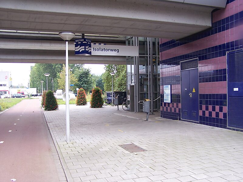 Isolatorweg metro station is the terminus of the Amsterdam metro 50 and opened on 28 May 1997. From 3 March 2019 this is also the terminus of the Amsterdam metro 51. The station is a railway embankment near the Isolatorweg on an industrial estate close to an electric generating station in the western harbour area of Amsterdam. Since there are no nearby residential areas, the station attracts relatively few visitors. The station has an island platform in the middle of a central access. Isolatorweg is the third metro station in Amsterdam that does not have an escalator.