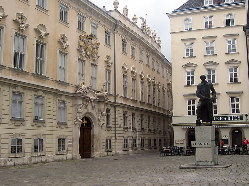 Judenplatz is a town square in Vienna's Innere Stadt that was the center of Jewish life and the Viennese Jewish Community in the Middle Ages. It is located in the immediate proximity of Am Hof square, Schulhof, and Wipplingerstraße. It exemplifies the long and eventful history of the city and the Jewish community focused on this place. Archaeological excavations of the medieval synagogue are viewable underground by way of the museum on the square, Misrachi-Haus. Two sculptural works, a carved relief and several inscribed texts are located around the square that all have subject matter relating to Jewish history. One of these sculptures is a statue of Gotthold Ephraim Lessing. The other is a memorial to Austrian Holocaust Victims, a project based on an idea of Simon Wiesenthal and unveiled in 2000. Created by British artist Rachel Whiteread, the memorial is a reinforced concrete cube resembling a library with its volumes turned inside out.