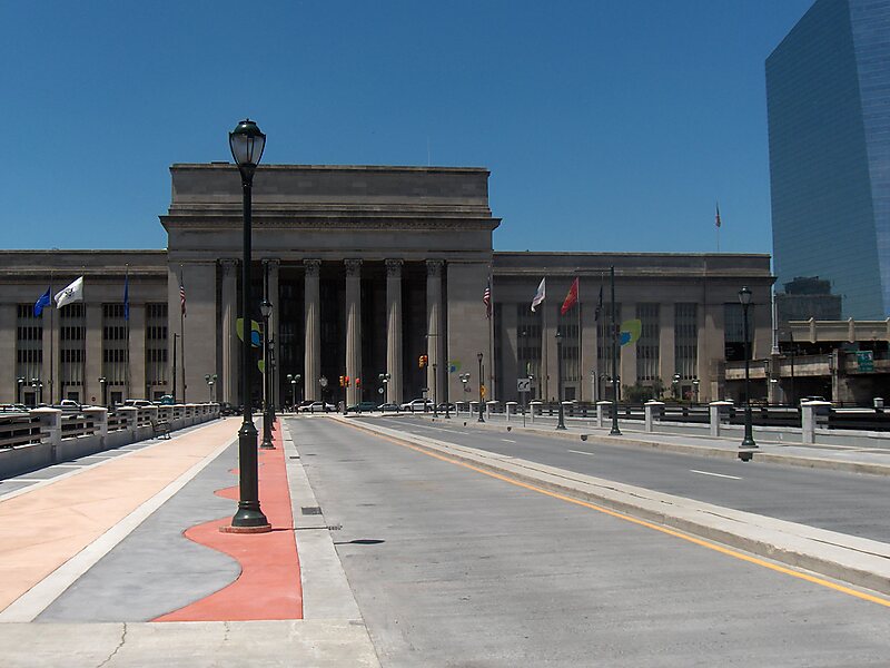 The John F. Kennedy Boulevard Bridge was built in 1959 and reconstructed 2009 by the Pennsylvania Department of Transportation. It carries three lanes of John F. Kennedy Boulevard across the Schuylkill River, Schuylkill River Trail, and CSX Transportation tracks. The overpass continues east, passing over 23rd, 22nd, and 21st streets to terminate at 20th Street. The bridge runs parallel to the SEPTA Regional Rail's Main Line tracks.
