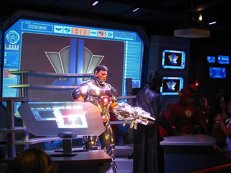 Justice League: Battle for Metropolis is an Interactive dark ride located at several Six Flags theme parks across North America. The ride is a collaboration between Sally Dark Rides, Alterface, Oceaneering International, and Pure Imagination Studios, and is themed to the Justice League, DC Comics' famous team of superheroes.Riders travel through the fictional city of Metropolis aboard enhanced-motion "RTVs" designed by A.R.G.U.S., and shoot digital targets generated on large 3D screens in real-time, as well as physical targets in full practical sets. There are many special effects in the ride such as fog and fire hidden in the attraction's various scenes.