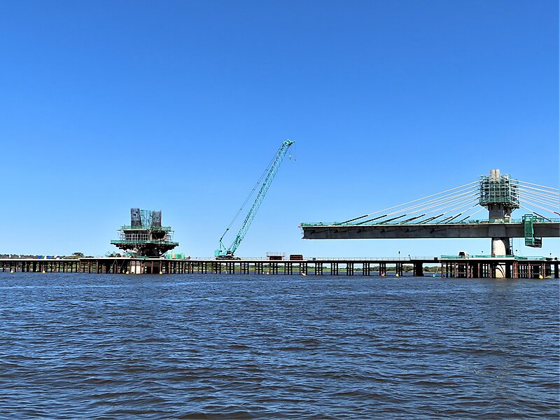 Kazungula Bridge is a road and rail bridge over the Zambezi River between the countries of Zambia and Botswana at the town of Kazungula. The 923-metre-long by 18.5-metre-wide bridge has a longest span of 129 metres and links the town of Kazungula in Zambia with Botswana. The bridge features a single-line railway track between two traffic lanes and walkways for pedestrians.Before the bridge was opened for traffic in May 2021, direct traffic between the two countries was possible only by ferry. The bridge takes advantage of the short 135-metre border the two countries share at the river, and is curved to avoid the nearby borders of Zimbabwe and Namibia.