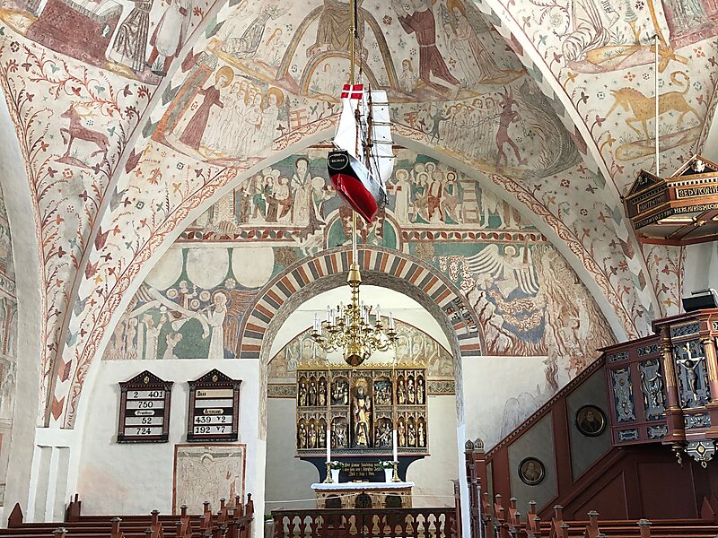 The imposing red brick church is one of the three Møn churches decorated with frescos by the Elmelunde Master, probably towards the end of the 15th century. In the Biblia pauperum style, they present many of the most popular stories from the Old and New Testaments. There are also a number of earlier frescoes in the church dating back to about 1275.