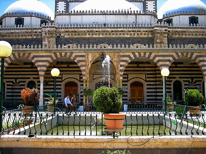 The Khalid ibn al-Walid Mosque is a mosque in Homs, Syria, located in a park along Hama Street in ash-Shuhada Square. The mosque is dedicated to Khalid ibn al-Walid, an Arab military commander who led the Muslim conquest of Syria in the 7th century following the decisive Battle of Yarmouk, which put an end to Byzantine rule in Syria. His dome-topped mausoleum is located in a corner of the prayer hall and has served as a pilgrimage center. Two tall minarets with narrow galleries constructed of alternating horizontal rows of white and black stone are situated at the building's northwestern and northeastern comers and reflect the traditional Islamic architecture style of the Levant.