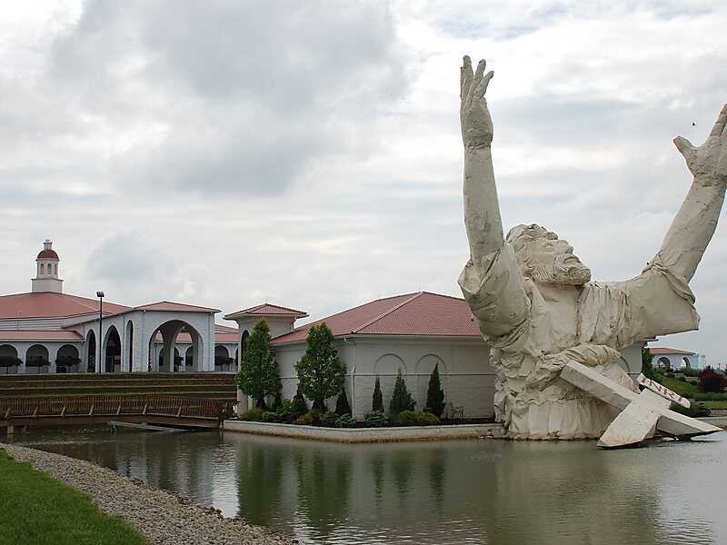 Located on the interstate-facing side of the church's outdoor amphitheater, the statue was set on an island at the head of the church's baptismal pool, flanked by fountains and lit by colored spotlights. It depicted Jesus from the chest up, with his arms and head raised to the sky. The statue had a 42-foot span between its upraised hands and a 40-foot Christian cross at its base. The completed statue weighed 16,000 pounds.
