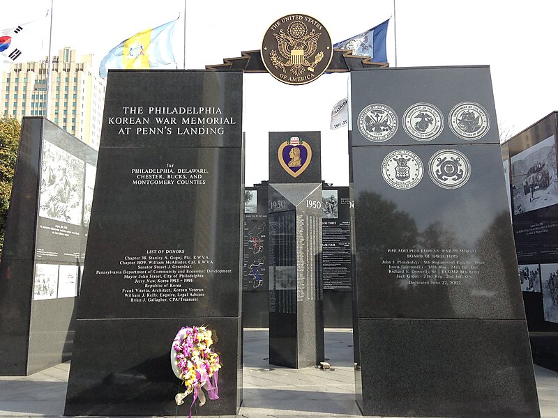 The Philadelphia Korean War Memorial at Penn's Landing in Philadelphia was initially dedicated on June 22, 2002 and was formally rededicated on Memorial Day, May 28, 2007 after additional work was completed. Each name of the more than 600 servicemen who were killed in action or listed as missing in action during the Korean War from Bucks, Chester, Delaware, Montgomery, and Philadelphia counties are etched in the memorial. Veterans Day and Memorial Day services are held onsite annually.The memorial is located in Korean War Memorial Park in the Society Hill neighborhood, about 0.5 mi from Independence Hall.