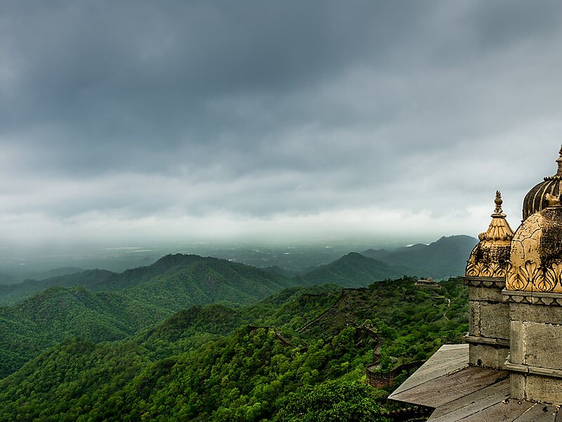Kumbhalgarh Wildlife Sanctuary is located in the Rajsamand District of Rajasthan State in western India. It surrounds the Kumbhalgarh fortress and covers an area of 610.528 km2. The sanctuary extends across the Aravalli Range, covering parts of Rajsamand, Udaipur, and Pali districts, ranging from 500 to 1,300 metres in elevation. It is part of the Khathiar-Gir dry deciduous forests ecoregion.