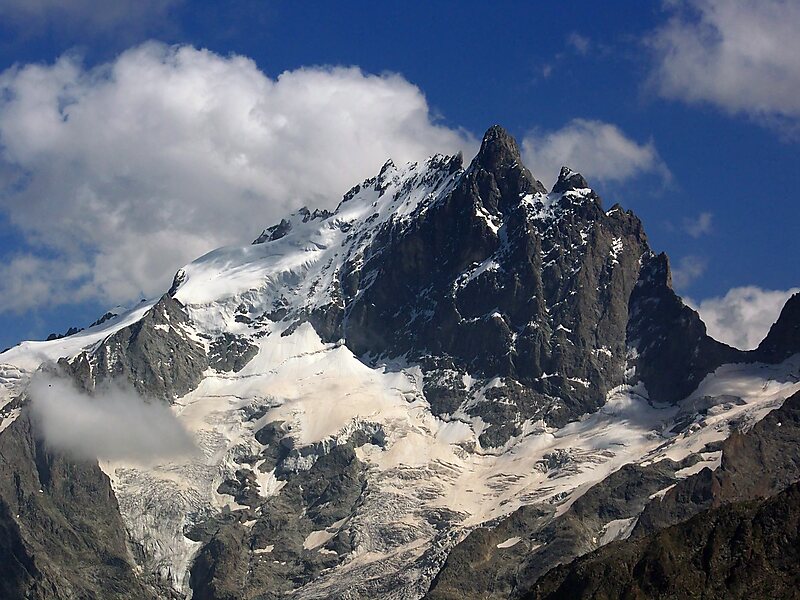 La Meije is a mountain in the Massif des Écrins range, located at the border of the Hautes-Alpes and Isère départements. It overlooks the nearby village of La Grave, a mountaineering centre and ski resort, well known for its off-piste and extreme skiing possibilities, and also dominates the view west of the Col du Lautaret. It is the second highest mountain of the Écrins after the Barre des Écrins.