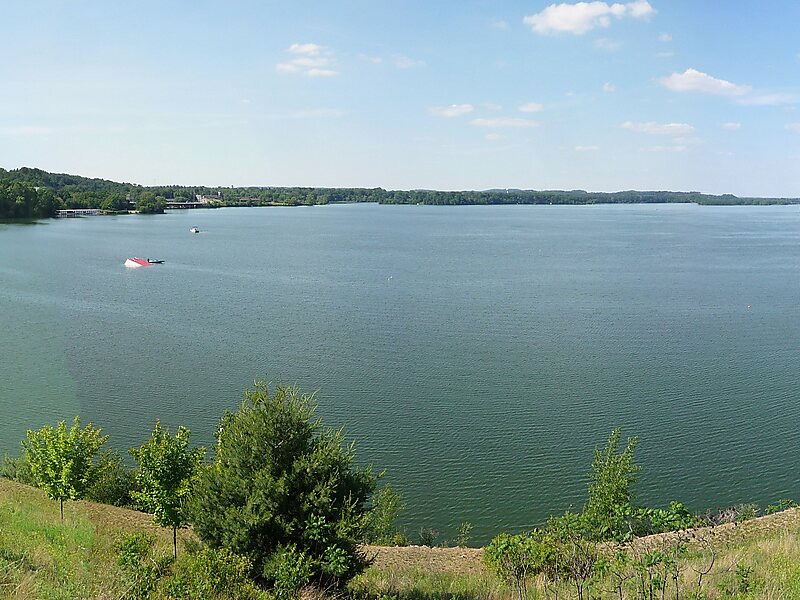 Along the lake's western and southern shores lies the city of Menomonie, the central business district of which is located at the far southern end of the lake, near the dam which forms it. There are multiple public parks, trails, beaches, and boat landings along the lake's shoreline. Common fish found in lake Menomin include Panfish, Largemouth and Smallmouth Bass, Northern Pike, and Walleye. Throughout the summer, blue-green algae blooms afflict the lake due to high nutrient levels.