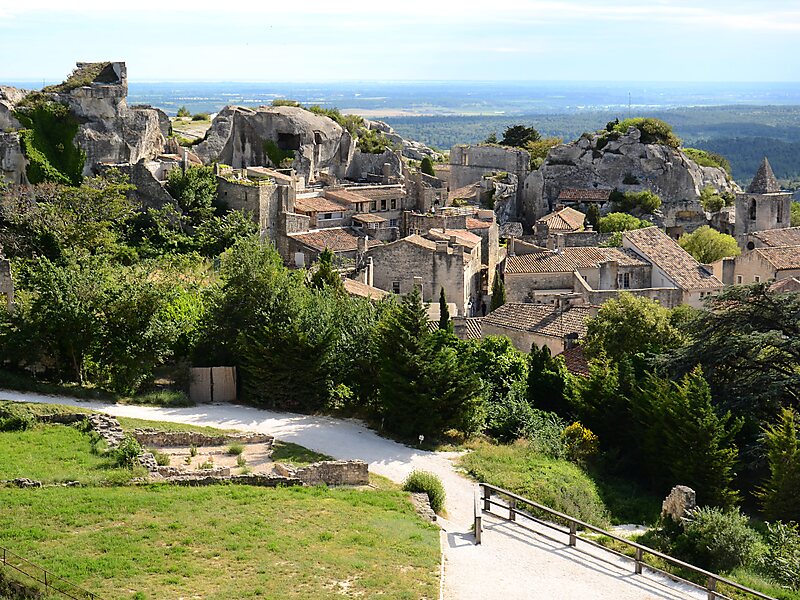 It is located in the Alpilles mountains, northeast of Arles, atop a rocky outcrop that is crowned with a ruined castle overlooking the plains to the south. Its name refers to its site: in Provençal, bauç is a rocky spur. From the village name the word bauxite was coined for aluminium ore when first discovered there by geologist Pierre Berthier in 1821. Until 13 August 1958, the commune was officially named La Baux.Renamed after the historical province of Provence, it is considered one of the most beautiful villages in France and has over 1.5 million visitors per year although it has only about 20 residents in the upper part of the commune and 315 for the whole commune. Inhabitants of the commune are known as Baussencs and Baussenques in French. The commune is part of Alpilles Regional Natural Park.