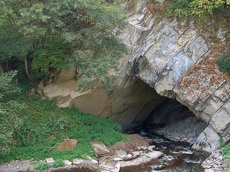 The source of the Lesse is near Libramont-Chevigny, in the Belgian province of Luxembourg. The Lesse flows roughly in north-western direction. Near Han-sur-Lesse the entire river goes underground, flowing through limestone caves. Many of the caves along the banks of the Lesse are important archaeological sites; these include the Trou de Chaleux, and the Trou des Nutons and Trou du Frontal at Furfooz. The Lesse flows into the river Meuse in the village of Anseremme, municipality of Dinant. Towns along the Lesse are Daverdisse, Han-sur-Lesse, Houyet and Anseremme.