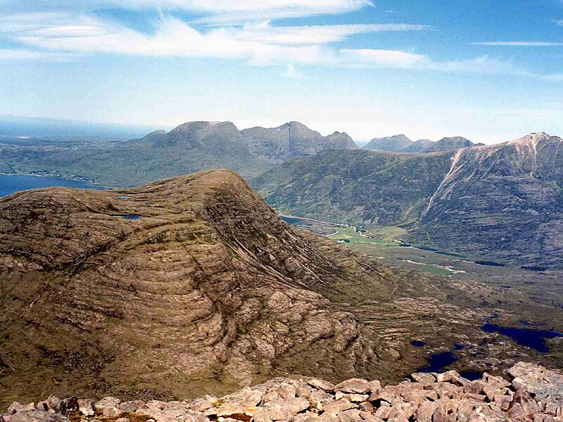 Maol Cheann-Dearg is a mountain in the Northwest Highlands of Scotland, between Upper Loch Torridon and Loch Carron, in the Coulags deer forest in Wester Ross. It is one of three Munros in this area and reaches a height of 933 metres, it is slightly isolated from the other two being separated by a low col of 420 metres and therefore tends to be ascended separately. The mountain is typical of the region in that geologically it is made up of a mixture of sandstone and quartzite, it has a steep flanks and is rock-strewn. The dome shaped summit is littered with red sandstone boulders and lacking in vegetation making its translated name of "red-headed brow" especially appropriate. The mountain is not to be confused with Maol Chinn-dearg, another Munro on the south Glen Shiel ridge.