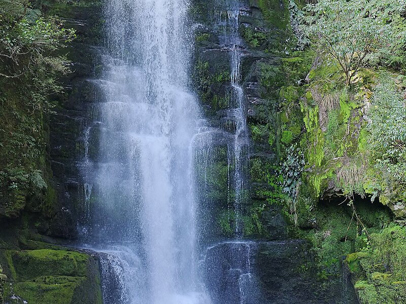 The McLean Falls on the Tautuku River in Catlins Forest Park descend a number of steep drop offs and terraces, with the very top of the waterfall, where it meets its first waterpool being 22-metres. It then descends for many more metres over a series of terraces. The McLean Falls are often described as the most spectacular in the region, with its sister waterfall, Purakanui being the most visited, due to it being more easily accessible.The entrance to the McLean Falls River Walk is three kilometres from the Southern Scenic Route on Rewcastle Road. The track from the road to the falls passes through a variety of native forest and shrub types: Rimu, Kamahi, divaricating shrubland, huge tree fuchsia, stands of olearia and podocarp forest.