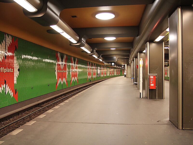 Architect Rümmler designed this station walls like the pattern of a M as in Mierendorffplatz. The next station is Richard Wagner Platz.