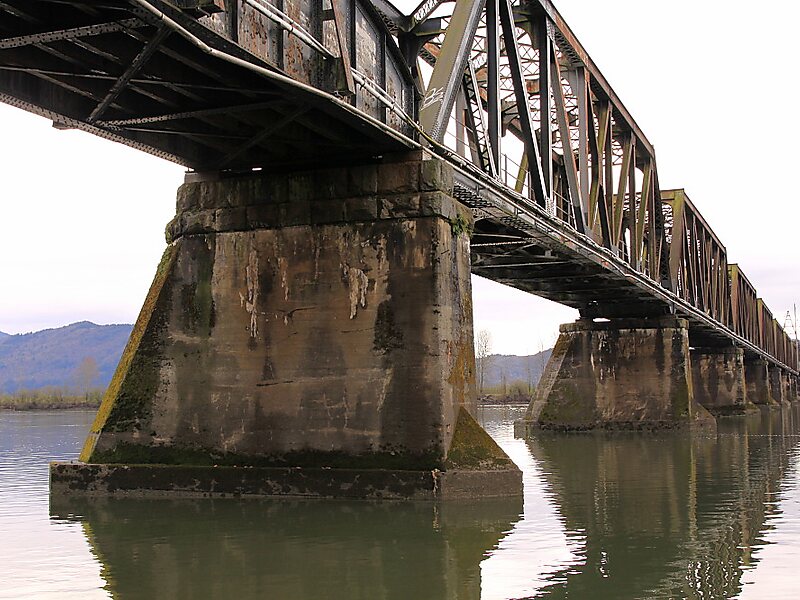 Replacing an earlier bridge built in 1891, which was the first and only bridge crossing of the Fraser below Siska in the Fraser Canyon until the construction of the New Westminster rail bridge in 1904, it was constructed in 1909 by the Canadian Pacific Railway. The Mission Railway Bridge is supported by 13 concrete piers and is approximately 533 metres in length. Before completion of the Mission highway bridge, highway traffic to and from Matsqui and Abbotsford with Mission used the bridge as a one-way alternating route, with traffic lights at either end to control direction. Rail traffic often held up car crossings, causing long and often very lengthy waits, which were a part of daily life in the Central Valley until the new bridge was completed.