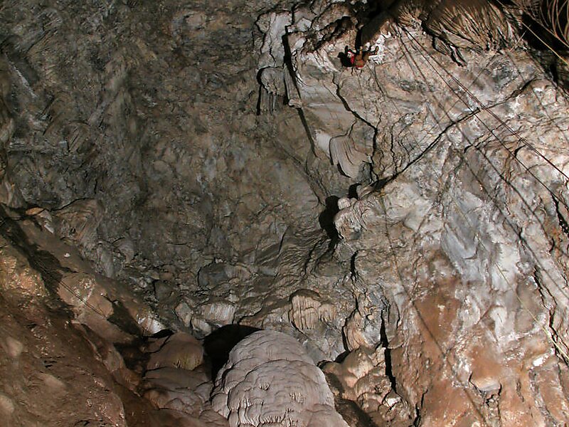 The portion of the cave developed for tourists consists of a spacious vertical shaft 165 feet tall, which is descended by a combination of stairs and a unique 100-foot-high spiral staircase built in the early 1900s. It is open to the public for walking tours and spelunking. Including the off-trail areas, the cave reaches a depth of 410 feet.