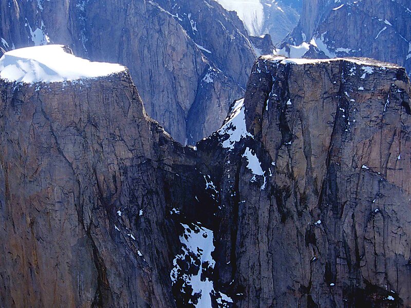 Mount Asgard is a twin peaked mountain with two flat-topped, cylindrical, rock towers, separated by a saddle. It is located in Auyuittuq National Park, on the Cumberland Peninsula of Baffin Island, Nunavut, Canada. The peak is named after Asgard, the realm of the Æsir in Norse mythology. Mount Asgard is perhaps the most famous of the Baffin Mountains.