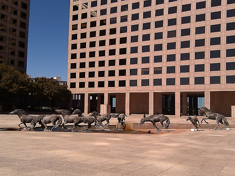 Mustangs of Las Colinas is a bronze sculpture by Robert Glen that decorates Williams Square in Las Colinas in Irving, Texas. It portrays a group of nine wild mustangs at 1.5 times life size running through a watercourse. Fountains give the effect of water splashed by the animals' hooves. The work was commissioned in 1976 and installed in 1984.