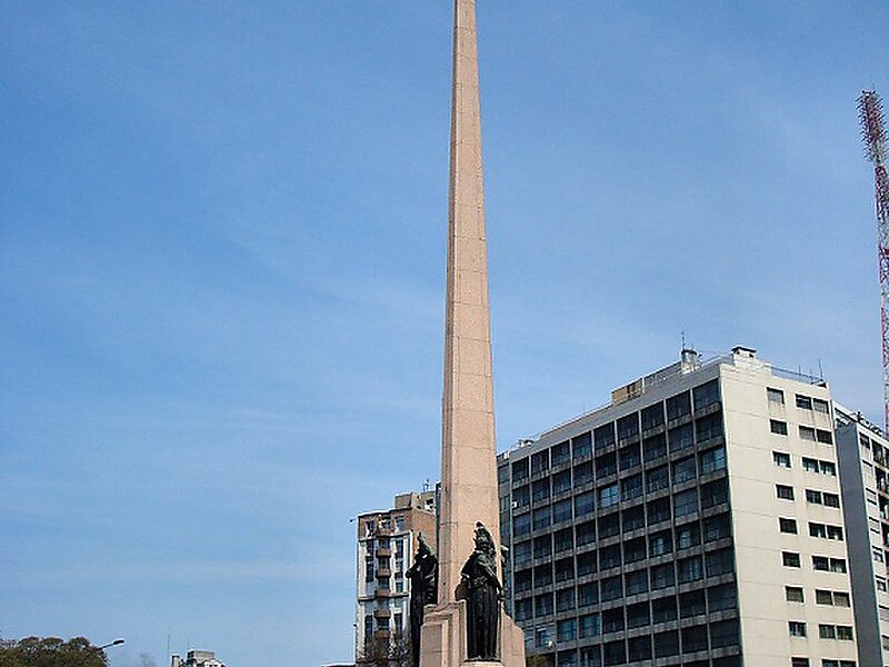 The Obelisk of Montevideo, officially Obelisk to the Constituents of 1830 is a monument created by sculptor José Luis Zorrilla de San Martín. It is a three-sided obelisk made of granite, 40 metres tall with three bronze statues on its sides, representing "Law", "Liberty" and "Force". It has a hexagonal water fountain around it with six spheres on its outer circumference. It is located at the intersection of 18 de Julio and Artigas Boulevard avenues, in Montevideo, at the entrance of the Parque Batlle area. It was built in 1930 to celebrate the 100th anniversary of the first Constitution of Uruguay and is an homage to the participants of the General Assembly of the first Constitution.Six years later, a similar but larger monument was built at the intersection of 9 de Julio and Corrientes avenues in Buenos Aires, to celebrate the 400th anniversary of the first founding of the city.