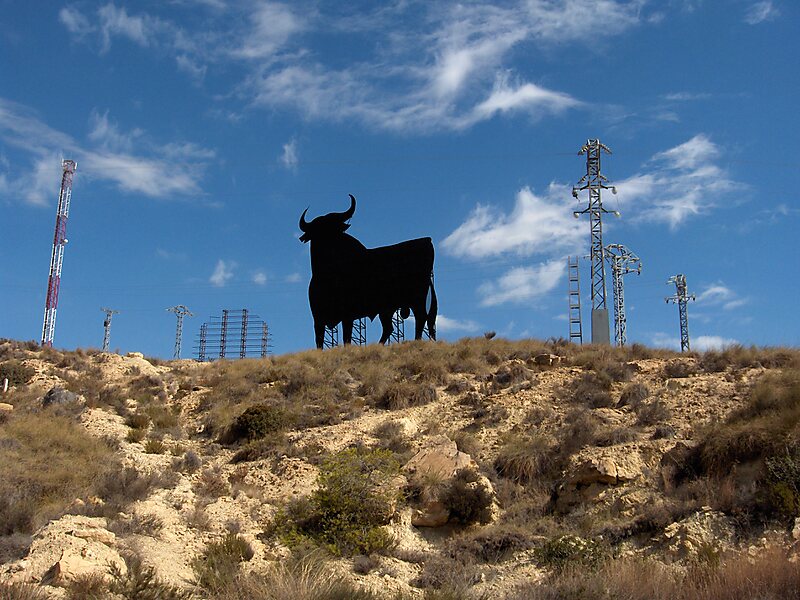 The Osborne bull is a 14-metre high black silhouetted image of a bull in semi-profile. There are at least 90 of them located outdoors all over Spain.