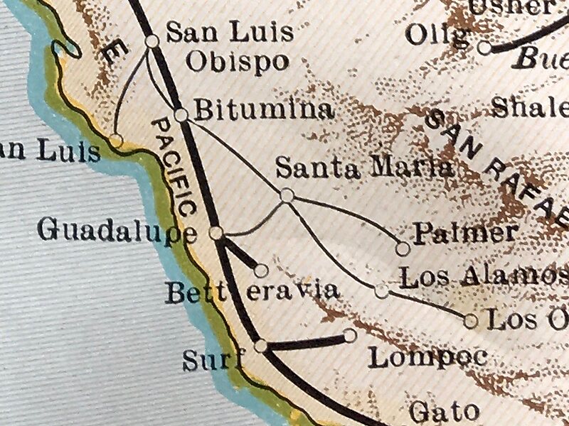 The Pacific Coast Railway was a 3 ft narrow gauge railway on the Central Coast of California. The original 10-mile link from San Luis Obispo to Avila Beach and Port Harford was later built southward to Santa Maria and Los Olivos, with branches to Sisquoc and Guadalupe.