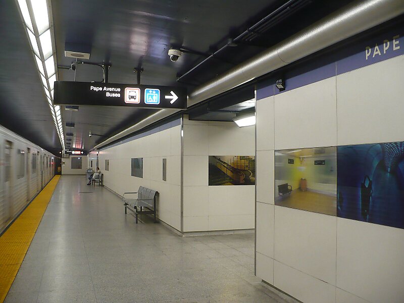 Pape is a subway station on the Bloor–Danforth line in Toronto, Ontario, Canada. The station opened in 1966 and is located in Toronto's Greektown neighbourhood at the northeast corner of Pape Avenue and Lipton Avenue, just north of Danforth Avenue. Wi-Fi service is available at this station.The ticket collector's booth and turnstiles are at the surface in the main station building on the southwest corner of the site with a secondary exit/entry structure to the east, adjacent to the parking lot. Bus bays are within the fare-paid zone. Stairs, escalators and elevators connect the ground level, concourse and train platforms. Automatic sliding doors, accessible fare gates and the addition of elevators, made the station became fully accessible in 2013.