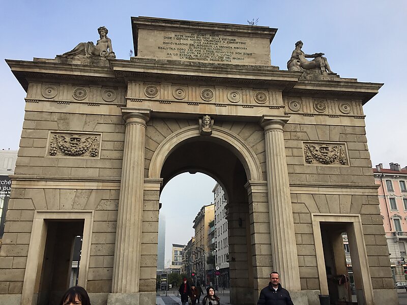 The Porta Garibaldi, previously known as the Porta Comasina, is a city gate located in Milan, Italy, on the old road to Como. The Neoclassical arch was built to commemorate the visit of Francis I of Austria in 1825. It was reconstructed from 1826 to 1828 by Giacomo Moraglia and dedicated to Garibaldi in 1860. Built in the Doric style, the gate is flanked by two portals overlooking the street. The customs houses were added in 1836. It's less than monumental proportions are better suited to the surrounding streets as the gate used to be at the end of a winding road, hardly compatible with a grandiose project.