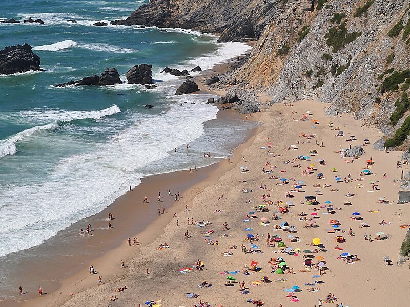 Praia da Adraga is a North Atlantic beach in Portugal, near to the town of Almoçageme, Sintra. It has been recommended in British newspapers. It is a "Blue Flag beach" with access for handicapped persons, It has an excellent restaurant and a very good emergency service system, although it is hard to reach by public transportation.