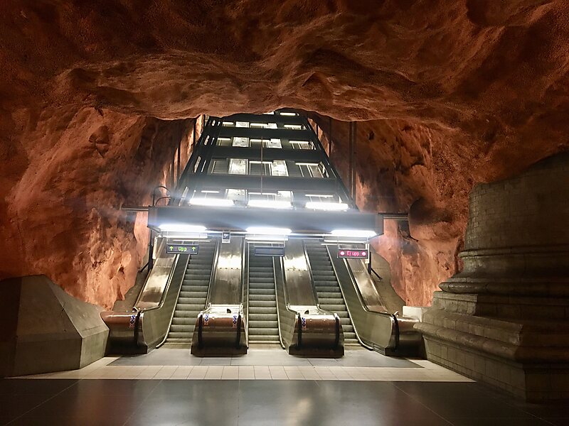 Like some other stations on the Stockholm metro, it uses organic architecture, which leaves the bedrock exposed and unsculptured and the station appearing to be based on natural cave systems.