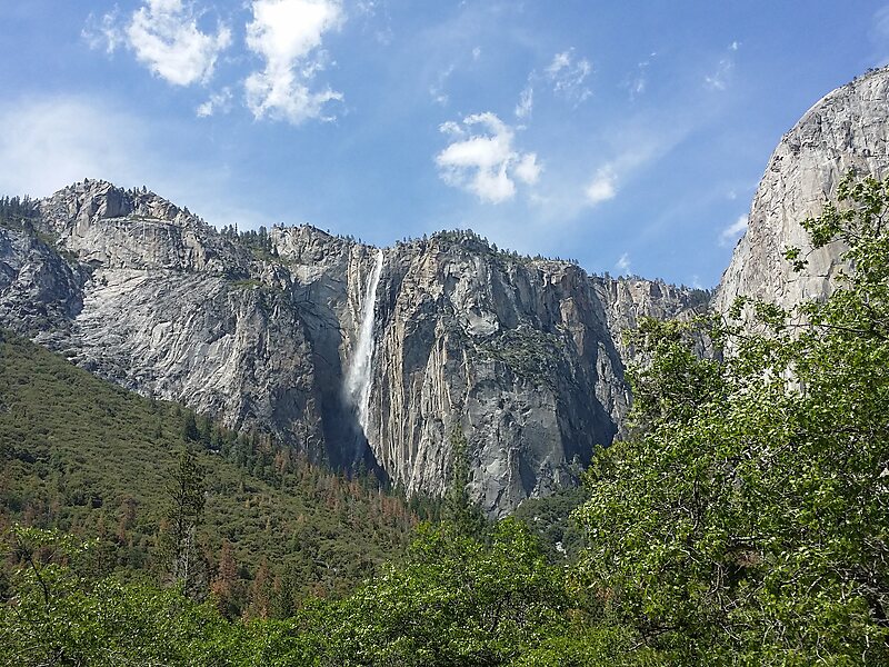 Ribbon Fall, located in Yosemite National Park in California, flows off a cliff on the west side of El Capitan and is the longest single-drop waterfall in North America. The fall is fed by melting winter snow; while therefore dry for much of the year, the fall is a spectacular 1,612 feet in the spring. In exceptional years, an ice cone develops at its base during the winter months similar to that which usually forms beneath Upper Yosemite Fall. This deposit can reach a depth of 200 feet, versus 322 feet for the greatest depth of the ice cone beneath the Upper Fall and Lower Fall. It is the tallest, continuous waterfall in the United States.