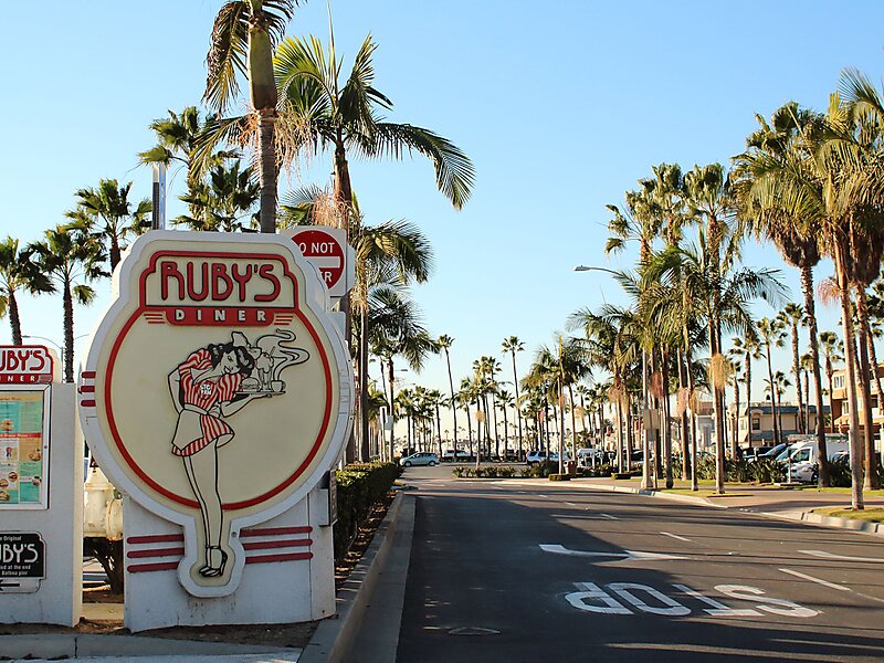 Ruby's Diner is a restaurant chain aesthetically designed after American diners of the Swing Era. Ruby's Diner serves breakfast, lunch and dinner, with a menu that includes classic American diner fare of hamburgers, French fries, chili and milkshakes along with soups, salads and sandwiches. To date, Ruby's Diner operates a total of 19 locations, including 14 in Southern California, one each in Arizona, Pennsylvania & New Jersey, and two in airports in Houston, TX and Las Vegas, NV.While the basic decor remains the same for every Ruby's Diner, creative touches are added to many by developing modified themes to fit the local area. For example, the Ruby's AeroDiner in Laguna Hills has a collection of miniature World War II aircraft that "fly" through the restaurant on a track.