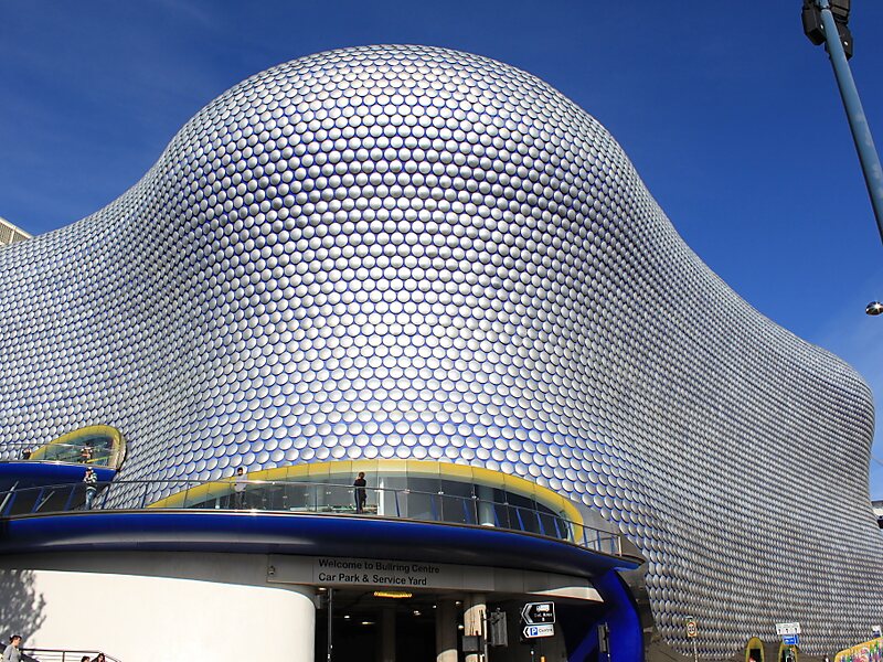 The Selfridges Building is a landmark building in Birmingham, England. The building is part of the Bullring Shopping Centre and houses Selfridges Department Store. The building was completed in 2003 at a cost of £60 million and designed by the architecture firm Future Systems. It has a steel framework with sprayed concrete facade. Since its construction, the building has become an iconic architectural landmark and seen as a major contribution to the regeneration of Birmingham.