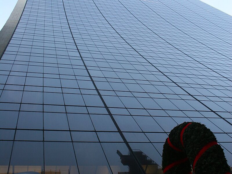 The Solow Building's north and south facades curve inward from ground level to the 18th floor, where the tower rises upward to the 50th story. The north and south walls are made of gray-tinted glass, while the west and east facades are clad in travertine.