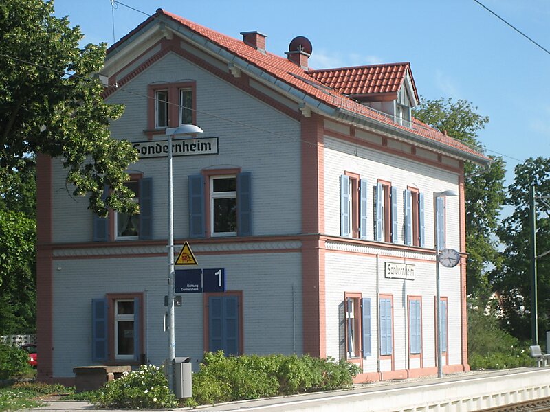 Sondernheim station is a station in the Germersheim suburb of Sondernheim, in the German state of Rhineland-Palatinate. Deutsche Bahn classifies it as a category 6 station and it has two platform tracks. The station is located in the network of the Karlsruher Verkehrsverbund and belongs to fare zone 575. Since 2001, the station has also been part of the area where the fares of the Verkehrsverbund Rhein-Neckar are accepted at a transitional rate. The address of the station is Germersheimer Straße 14. Its former entrance building is under heritage protection.