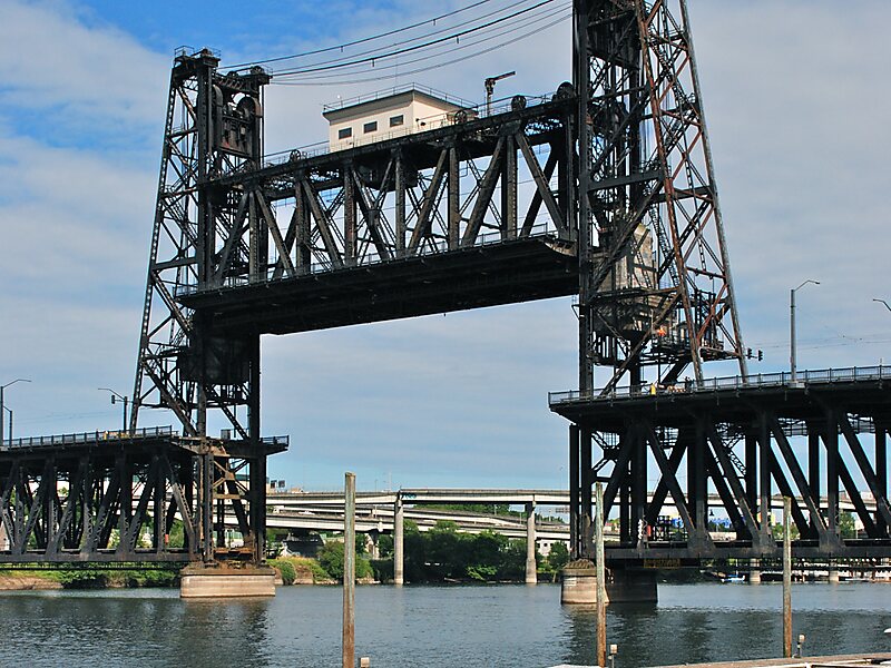The Steel Bridge is a through truss, double-deck vertical-lift bridge across the Willamette River in Portland, Oregon, United States, opened in 1912. Its lower deck carries railroad and bicycle/pedestrian traffic, while the upper deck carries road traffic, and light rail, making the bridge one of the most multimodal in the world. It is the only double-deck bridge with independent lifts in the world and the second oldest vertical-lift bridge in North America, after the nearby Hawthorne Bridge. The bridge links the Rose Quarter and Lloyd District in the east to Old Town Chinatown neighborhood in the west.