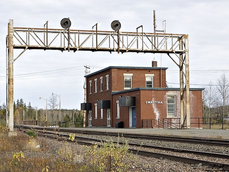 Swastika is a small community founded around a mine site in Northern Ontario, Canada in 1908. Today it is within the municipal boundaries of Kirkland Lake, Ontario. It has frequently been noted on lists of unusual place names.Swastika is a junction on the Ontario Northland Railway, where a branch to Rouyn-Noranda, Quebec leaves the ONR's main line from North Bay, Ontario to Moosonee. Until 2012, the Northlander passenger railway service between Toronto and Cochrane served the Swastika railway station with connecting bus service running along Highway 66 into downtown Kirkland Lake.