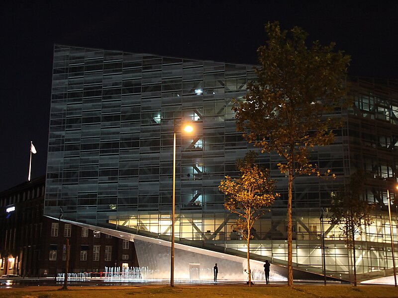 The Crystal is a free-standing, environmentally friendly extension of Nykredit headquarters at the Kalvebod Brygge waterfront in Copenhagen, Denmark. Designed by Schmidt Hammer Lassen, it takes its name from its light, crystalline form which rests on only a single point and a single line, allowing for unhindered views as well as passage underneath the building.