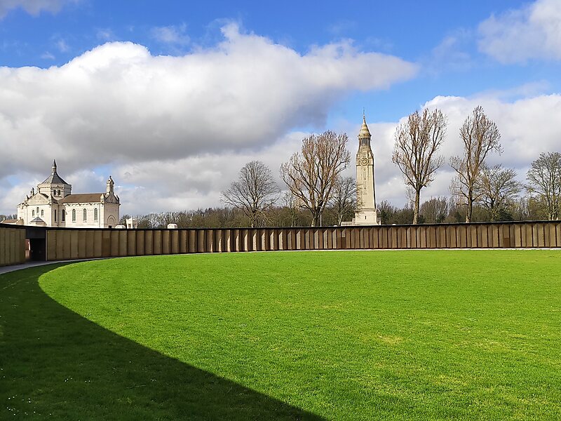 L’Anneau de la Mémoire is a World War I memorial in Ablain-Saint-Nazaire, France. Designed by Philippe Prost and inaugurated on 11 November 2014, the 96th anniversary of Armistice Day, the memorial honors the 576,606 soldiers of forty different nationalities who died at Nord-Pas-de-Calais. The memorial is located at the site of the national cemetery of Notre-Dame-de-Lorette. The monument consists of 500 metal panels that are arranged in an ellipse pattern, each 3 meters in height. Each panel contains approximately 1200 names of fallen soldiers, listed alphabetically by last name. The 500th panel remains blank so that any newly discovered names may be inscribed. The most noteworthy aspect of the Ring of Memory is that it is the first memorial to list alphabetically, with no regard to rank nor nationality.