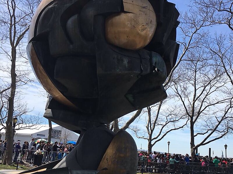 The spherical caryatid was installed in Battery Park between 2002 and 2017, when the Port Authority of New York and New Jersey moved it to Liberty Park, overlooking the September 11 Memorial and its original location.
