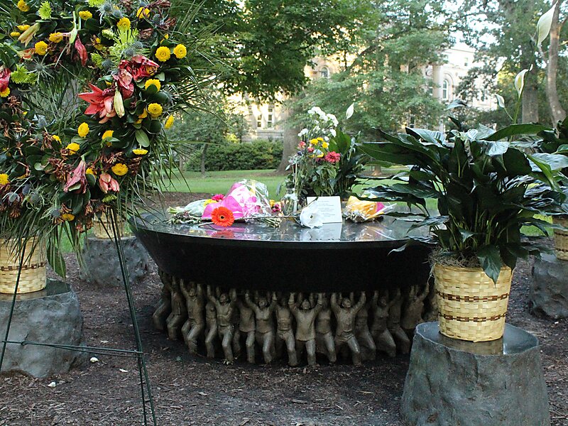 The Unsung Founders Memorial at the University of North Carolina at Chapel Hill is a memorial located in McCorkle Place, one of the University's quads. It consists of a black granite tabletop supported by 300 bronze figurines and surrounded by 5 black stone seats. The inscription around the edge of the table reads: