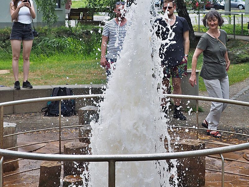Experts disagree on whether the Wallender Born can be described as eruptive course, but periodic gas outbreaks have been witnessed since time immemorial. Until being drilled, Wallender Born was therefore at least a mofette. The high water surge of a typical hot spring was found only after construction work. The fountain is operated geyser-like: The artificial conduit is located below the water surface of a small pond. The water is therefore not thrown like a fountain, but turbulent. The "fuel gas" of the geyser is carbon dioxide. It contains traces of other gases like hydrogen sulfide which leads to a smell reminiscent of rotten eggs.