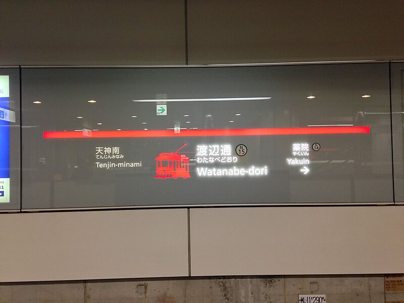 Watanabe-dōri Station is a train station located in Chūō-ku, Fukuoka. Watanabe-dōri means "Mr. Watanabe's avenue" in Japanese, to commemorate Yohatirō Watanabe's efforts to establish the tram line here in 1911. The station's symbol mark is a tram that used to run here.