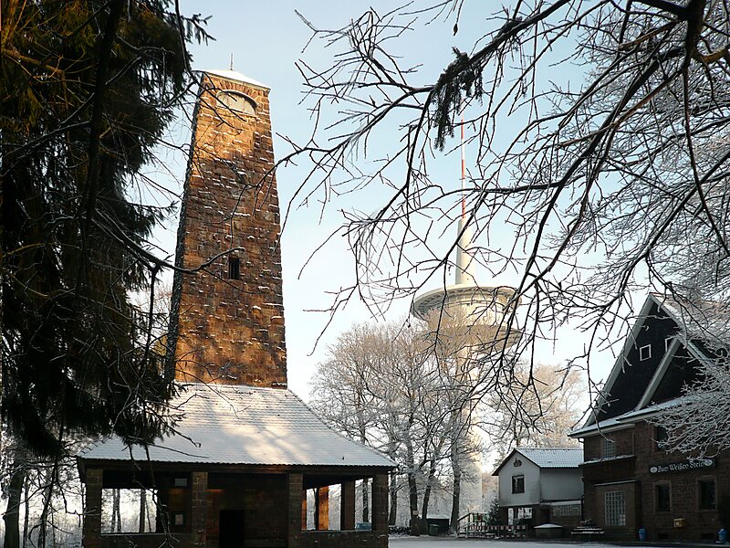 On Weißer Stein is a 20 m tall lookout tower. It was built in 1906 by the members of the Odenwald club. In good weather other high mountains of the Odenwald can be seen, such as Melibokus, Katzenbuckel, Tromm and Neunkircher Höhe. Near the tower is the Höhengaststätte Weißer Stein tavern with a beer garden.
